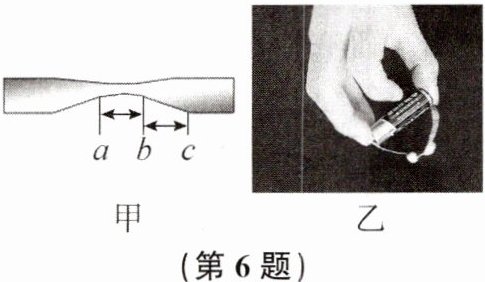6. (2024秋·嘉兴市期末)小科以电池和口香糖包装锡纸为材料制作取火工具:取口香糖包装锡纸,中间剪掉一些(如图甲所示)。将锡纸条两端分别接在电池的正负极,很快发现锡纸条的$ab$段先冒烟着火(如图乙所示)。已知$ab和bc$长度相等,则通电时,与$bc$段相比,$ab$段的 (