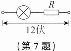 7. (2024秋·杭州市上城区期末)把一个标有“10 V 3 W”字样的小灯泡和定值电阻$R$串联后接在电压为12伏的电源上(如图所示),小灯泡恰好能正常工作。该电路工作10秒定值电阻产生的热量是 (