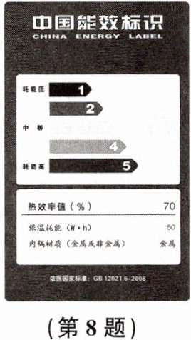 8. (2024秋·湖州市德清县期末)如图所示为小清家电饭锅的能效标识牌,通过查阅资料可知:热效率值是指将电能转化为热能的效率;保温能耗“50W·h”是指1小时消耗的电能。从节能角度分析,我们应选热效率值