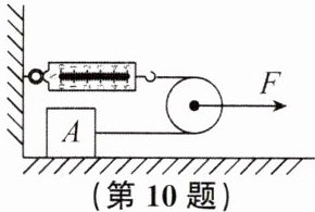 10. 如图所示,滑轮重力和绳子摩擦不计,物体A在拉力F的作用下做匀速直线运动,若弹簧测力计的示数为5牛,则拉力F为