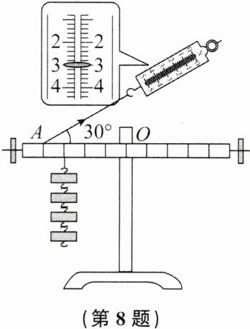 8. 如图所示,在“探究杠杆的平衡条件”的实验中,已知杠杆上每个小格的长度为2厘米,当弹簧测力计在A点斜向上拉(与水平方向成30°角)杠杆,使杠杆在水平位置平衡时,下列说法中,正确的是 (
