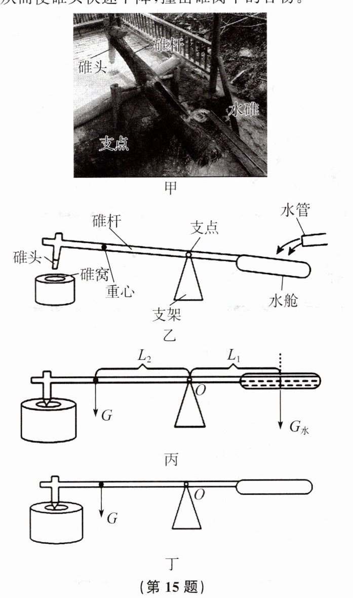 15. 水碓(如图甲所示)是一种利用水能来实现自动舂米的机器。某小组同学仿照云南省临沧市古墨村水碓制作水碓模型,其结构如图乙所示。其中碓头、碓杆和水舱是一个整体,可与支架分离。水注入水舱后会使碓头缓缓抬起,到达一定位置后水舱中的水就会从尾部流出,从而使碓头快速下降,撞击碓窝中的谷物。