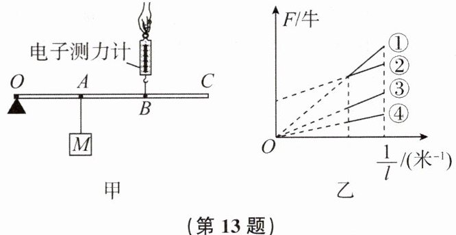 13. 如图甲所示,轻质杠杆(长为l)可绕O点转动,A点悬挂一重为12牛的物体M,杠杆水平静止,已知OA= AB= BC,细绳对杠杆的拉力F=