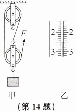 14. 用如图甲所示的滑轮组探究动滑轮的重力对滑轮组机械效率的影响。实验中把不同的磁铁吸附在动滑轮边框上以改变动滑轮的重力,每次实验时都匀速拉动绳子自由端使物体上升10厘米,实验数据如表所示。