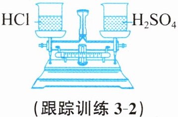 跟踪训练3-2 如图所示,在托盘天平的两边各放一只烧杯,调节至平衡,往右边的烧杯里注入一定量的稀硫酸,左边的烧杯里注入相同质量的盐酸。