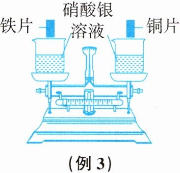 例3 (2024秋·杭州市上城区期末)小金在已调平的托盘天平的左、右两盘上各放一个相同质量的烧杯,往烧杯中分别加入相同溶质质量分数的硝酸银溶液,天平再次平衡,如图所示。现往烧杯中分别放入已打磨的质量相同的铁片和铜片。下列说法中,正确的是 (