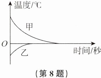 8. 炎热的夏天,小嘉将一瓶饮料放在泡沫箱中的冰块上,两者的温度随时间的变化如图所示。下列说法中,正确的是 (