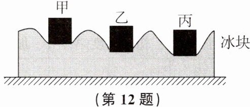 12. 将质量相同的甲、乙、丙三块金属加热到相同的温度后,放置在上表面平整的冰块上。经过一段时间,冰块形状不再变化时的情景如图所示。三块金属中,比热容最小的是
