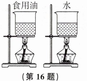 16. 为了比较水和食用油的吸热能力。小明用两个相同的装置做了如图所示的实验,用温度计测量液体吸收热量前后的温度值,并用秒表记录加热时间,实验数据记录如表所示。