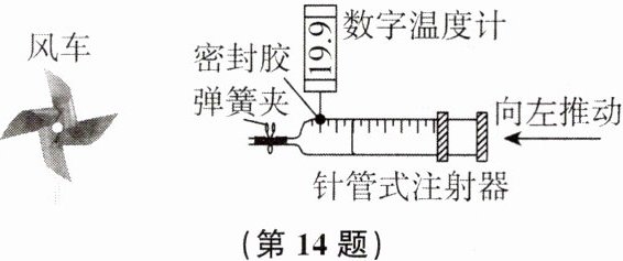 14. 小科利用注射器、数字温度计、风车等生活中的简单材料,设计了一个探究物体内能的实验方案,如图所示。