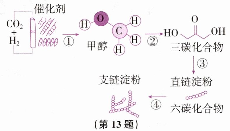 13. 我国科研人员在国际上首次实现了二氧化碳到淀粉的合成。如图所示为“搭积木”式的合成路线,原理简化如下:二氧化碳和氢气在反应罐中催化剂的作用下合成甲醇(${CH_{3}OH}$),用两种生物酶催化甲醇形成三碳化合物继而得到淀粉。