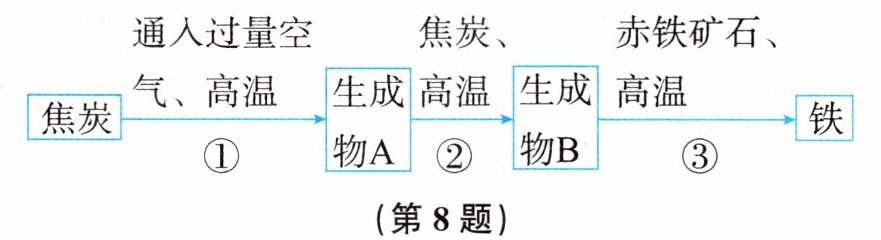 8. 某钢铁厂高炉炼铁的主要原料为焦炭、赤铁矿石(主要含$Fe_{2}O_{3}$)等,主要反应过程如图所示: