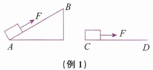 【例1】如图所示,用大小相等的拉力$F$,分别沿斜面和水平面拉木箱,拉力方向和运动方向始终一致,运动时间$t_{AB}>t_{CD}$,运动距离$s_{AB}= s_{CD}$,比较两种情况下拉力所做的功和功率 ()
