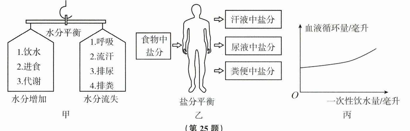 25. 人在进行较长时间的剧烈运动后会口渴,有些人会一次性饮用大量水直至不再感觉口渴。这种饮水方法科学吗?为此小明查阅相关资料并获得下列信息: