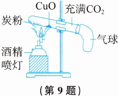 9. 小乐利用如图所示的装置和药品进行实验。实验时,先加热炭粉,一段时间后,将酒精喷灯移至$CuO$处加热,最终$CuO$变为紫红色固体。下列分析中,错误的是(