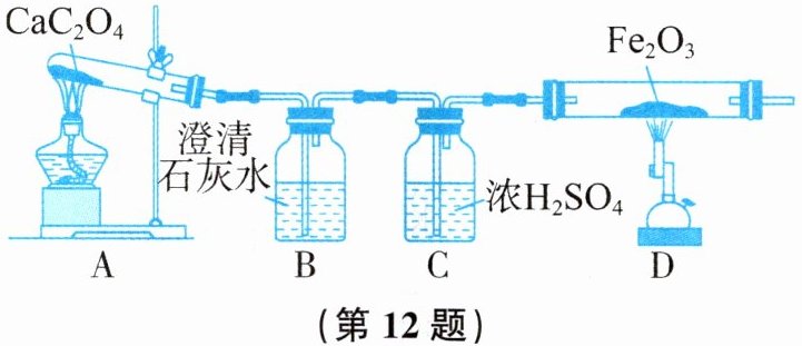 12. 已知草酸钙($CaC_{2}O_{4}$)加热易分解,其化学方程式为$CaC_{2}O_{4}\overset{加热}{\xlongequal{\;\;}}CaO+CO\uparrow +CO_{2}\uparrow$。为验证分解产物中既有$CO又有CO_{2}$,小明设计了如图所示的实验装置。