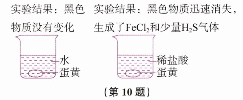10. 茶叶蛋的蛋黄表面常有一层黑色的物质,有人担忧它是否能食用。小明决定利用科学知识来揭秘。他取两个带有黑色物质的蛋黄开展实验,如图所示。