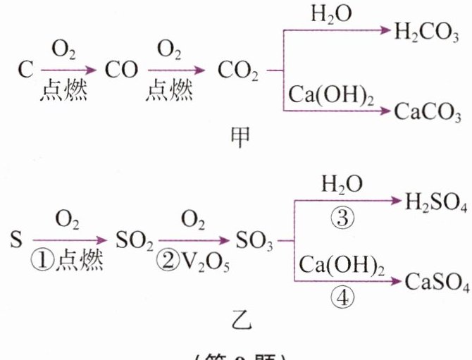 9. 我们曾学过碳及碳的化合物的相关知识,它们之间的转化关系如图甲所示;硫及硫的化合物间的转化关系如图乙所示: