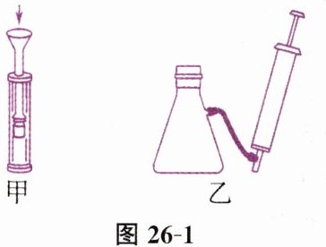(2)如图26-1甲所示,取一个配有活塞的厚玻璃筒,筒内放一小团浸有少量乙醚的棉花。快速将活塞向下压,观察到棉花的情况是
