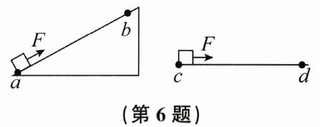 6. 如图所示,用大小相等的拉力F,分别沿光滑的斜面和粗糙的水平面拉木箱,拉力方向和运动方向始终一致,运动时间$ t_{ab}>t_{cd} 运动距离 s_{ab}= s_{cd} $,比较两种情况下拉力所做的功和功率可知(