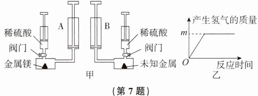 7. (2024秋·台州市路桥区期末)小柯利用自制装置探究金属活动性强弱,如图甲所示。在装置内分别加入表面打磨过的等质量、等表面积的金属镁和一种未知金属,用注射器同时注入等质量、等溶质质量分数且过量的稀硫酸与金属混合并关闭注射器下方阀门。随着反应的进行,A注射器收集的气体多于B,一段时间后变为B收集的气体多于A。如图乙所示为稀硫酸与镁反应产生的氢气质量与反应时间的关系。