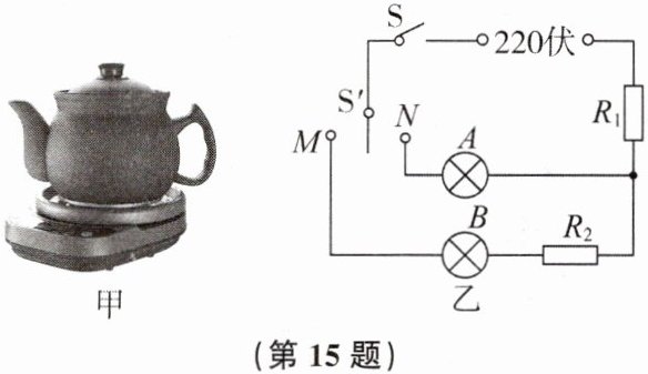 15. 如图甲所示为某同学家的电中药壶,其具有猛火和文火两个挡位,工作电路简化图如图乙所示,其中$S'$为挡位开关,电阻$R_{1}$、$R_{2}$为发热体,A、B为阻值可忽略不计的指示灯。当电中药壶处于猛火挡时,红灯亮;处于文火挡时,绿灯亮。电中药壶的额定电压为220伏,猛火挡的额定功率为1210瓦,$R_{2}= 180$欧。