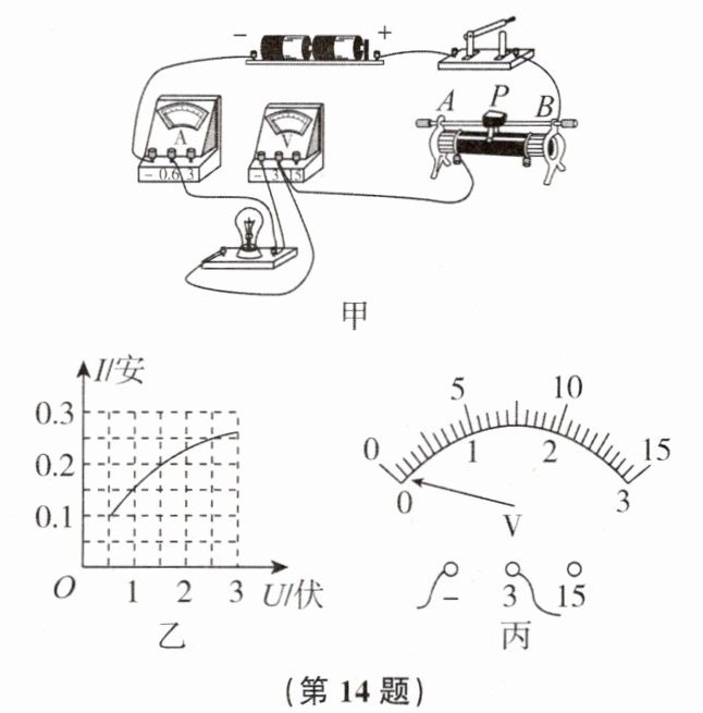14. 为测定小灯泡的额定功率,小柯利用电压恒为3伏的电源、滑动变阻器、标有“2.5V”字样的小灯泡等器材,按图甲所示的方式连接电路进行实验。