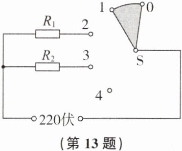 13. 学习了焦耳定律的内容后,小科想设计一个有低温、中温和高温三个挡位的电加热器,其电路图如图所示,电源电压为220伏,$R_{1}$、$R_{2}$是电热丝,开关S接触相邻的两个触点,已知$R_{1}= 121$欧。