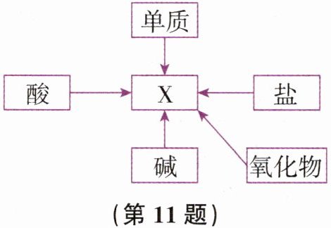 11. 小科学习了物质的性质后,梳理单质、氧化物、酸、碱、盐与X之间的转化关系如图所示。“→”表示某一种物质经一步反应可转化为另一种物质,部分反应物、生成物及反应条件已略去。下列说法中,正确的是(