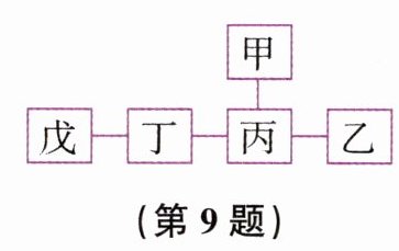 9. 甲、乙、丙、丁、戊分别是${Fe_{2}O_{3}}$、${H_{2}SO_{4}}$、${Ba(OH)_{2}}$溶液、${Na_{2}CO_{3}}$溶液、${CO_{2}}$中的一种。图中横线表示相邻物质可以相互反应,且丙与甲、乙、丁均能反应生成白色沉淀,甲、丙产生的白色沉淀能和丁溶液反应。下列说法中,正确的是(