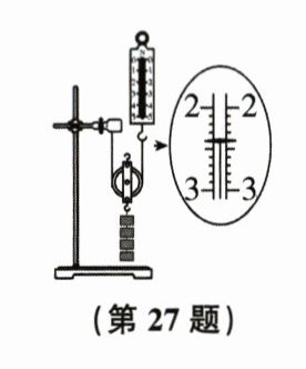 27. 在“探究影响动滑轮机械效率的因素”的实验中,小佳用同一动滑轮进行了三次实验,实验装置如图所示。