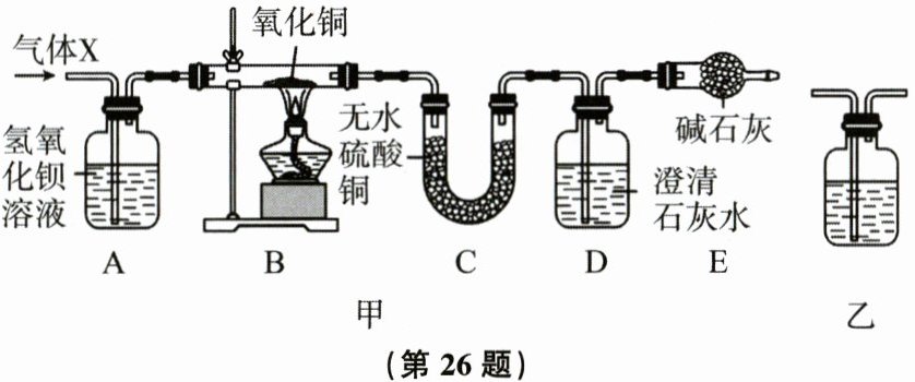 26. 某混合气体X由$ \mathrm{CO}_{2} $、CO、水蒸气、$ \mathrm{H}_{2} $中的两种或两种以上物质组成,气体X依次通过如图甲所示的装置(假定每步反应均完全),现象分别为A中溶液变浑浊,B中固体变为红色,C中粉末变为蓝色,D中溶液变浑浊。