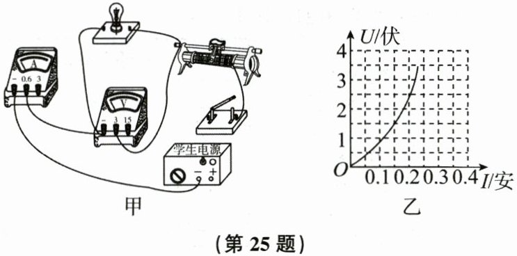 25. 小明做“测量小灯泡电功率”实验时,所用器材有电压为6伏的电源、额定电压为2.5伏的小灯泡以及符合实验要求的滑动变阻器、电压表、电流表、开关和导线。