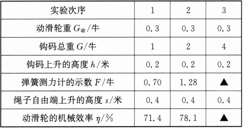 (结果精确到0.1%)。(3)分析表中数据可知:用同一动滑轮将物体匀速提升相同的高度时,随着钩码总重的增加,拉力所做的额外功将