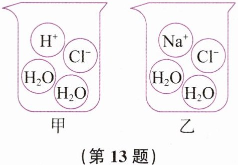 13. 如图所示分别为稀盐酸和氯化钠溶液的微观示意图,小科在两种溶液中分别滴加紫色石蕊试液,发现甲烧杯中紫色石蕊试液变红,乙烧杯中紫色石蕊试液不变色。