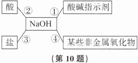 10. 某同学总结了NaOH的四类化学性质(即NaOH能够与四类物质发生化学反应),如图所示。