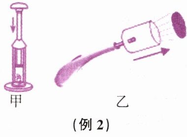 【例2】如图所示,图甲中活塞迅速下压后棉花燃烧;图乙中点火后(酒精燃烧)盒盖飞出。在活塞压缩空气和使盒盖飞出两个过程中,对比能量转化情况、改变筒内气体内能的方式和筒内气体内能的变化三个方面,两个过程()