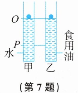 7. 一端封闭的两根完全相同的玻璃管(如图所示),甲中装水,乙中装食用油。两个完全相同的金属小球从O处由静止释放,下落到P处,小球在食用油中下落的时间更长。比较两小球从O处到P处的下落情况,两小球重力所做的功$W_{水}$