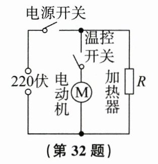 32. 小明家的豆浆机的简化电路和铭牌如图所示。豆浆机工作时加热器先加热,待水温达到64℃时温控开关闭合,电动机开始工作且加热器继续加热,直到产出豆浆成品,电源开关自动断开。小明用初温为20℃、质量为1千克的水和少量豆子制作豆浆,设电源电压保持220伏不变,导线的电阻不计。求: