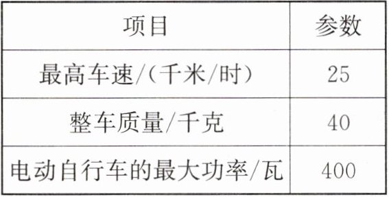 (1)电动自行车行驶时,对地面的压力 $ F = G_{\text{总}} = (m_{\text{车}} + m_{\text{人}})g = (40 $ 千克 $ + 60 $ 千克 $ ) × 10 $ 牛/千克 $ = 1000 $ 牛,受力面积 $ S = 50 $ 厘米 $ ^{2} = 0.005 $ 米 $ ^{2} $,电动自行车行驶时对地面的压强 $ p = \frac{F}{S} = \frac{1000 \text{ 牛}}{0.005 \text{ 米}^{2}} = 2 × 10^{5} $ 帕。