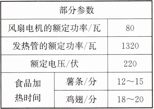 【例题】空气炸锅是一种新型家电,如图所示为某型号空气炸锅的内部简化电路,部分参数和食品加热时间如表所示。其工作原理是通过发热管迅速加热锅内空气,利用大功率风扇形成循环的热流,使盛放在锅内的食品均匀受热,不放油也能达到类似煎炸的效果。