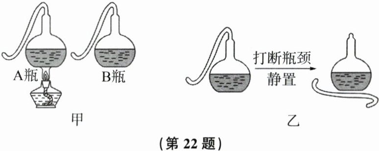 22. 19世纪中叶,法国微生物学家巴斯德设计了一个巧妙的实验:如图所示,A、B瓶内都盛有肉汤,图甲中A瓶肉汤煮沸,B瓶不作处理,一段时间后,其中一瓶中肉汤仍然新鲜,另一瓶中肉汤变质;接着,将肉汤新鲜的那瓶的瓶颈打断(如图乙所示),数日后,该瓶中肉汤也变质。