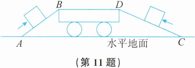 11. 如图所示,为了把两件相同的货物搬运到平板货车上,工人用相同材质的木板搭建了$AB$、$CD$两个斜面($AB<CD$,且$B$、$D$等高),用沿斜面向上的力将其中一件货物从斜面$AB$的底端匀速推到顶端,另一件货物以同样的速度沿斜面$CD$推上顶端。下列说法中,正确的是(