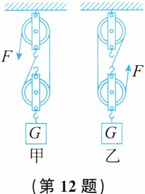 13. 如图甲所示为用滑轮组匀速提升重物的示意图;如图乙所示为卷扬机对绳子竖直向下的拉力$F与卷扬机拉绳子的速度v$的关系图,卷扬机拉绳子的功率$P$保持不变,动滑轮重为90牛。不计绳重及摩擦。