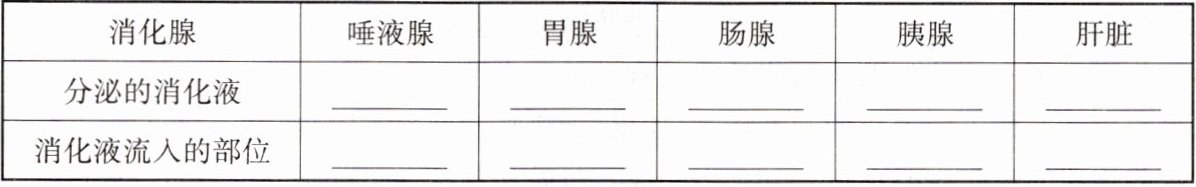 第二行:唾液 胃液 肠液 胰液 胆汁 第三行:口腔 胃 小肠 小肠 小肠