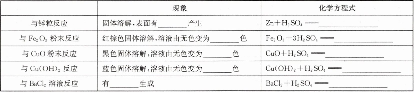第二行:气泡 $ ZnSO_{4} + H_{2} \uparrow $ 第三行:黄 $ Fe_{2}(SO_{4})_{3} + 3H_{2}O $ 第四行:蓝 $ CuSO_{4} + H_{2}O $ 第五行:蓝 $ CuSO_{4} + 2H_{2}O $ 第六行:白色沉淀 $ BaSO_{4} + 2HCl $