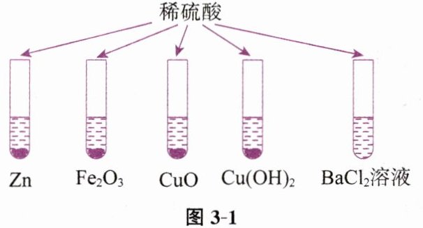 将稀硫酸分别滴入盛有锌粒(Zn)、$Fe_2O_3$粉末、CuO粉末、$Cu(OH)_2$固体、$BaCl_2$溶液的试管中,如图3-1所示。