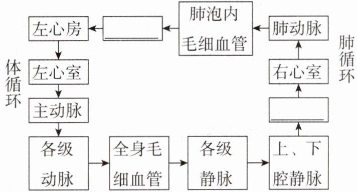 根据体循环和肺循环的连接关系,体循环是左心室→主动脉→各级动脉→全身毛细血管→各级静脉→上、下腔静脉→右心房,肺循环是右心室→肺动脉→肺泡内毛细血管→肺静脉→左心房,这里右心室与右心房相连,所以此处应填“右心房”。