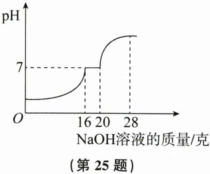 25. 小科发现购买的盐酸清洗剂不是无色而是黄色的,原来是因为其主要成分中含有少量的氯化铁。为测定一瓶净含量为2千克的盐酸清洗剂中氯化铁的含量(假设除盐酸和氯化铁外,其他成分不参与反应),小科在老师的帮助下做了如下实验:取20克盐酸清洗剂加入小烧杯中,然后向小烧杯中缓慢滴加溶质质量分数为10%的氢氧化钠溶液,同时用电子pH计不断读取反应时的pH,得到如图所示的关系。
