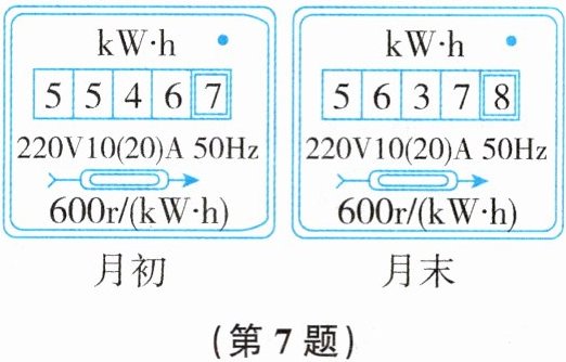 7. 如图所示分别为小科家上月初和上月末电能表的表盘示数,下列选项中,正确的是(